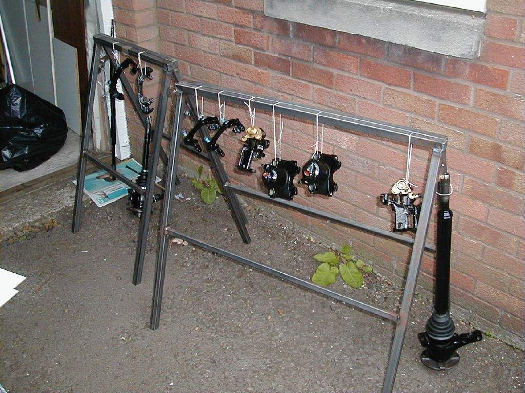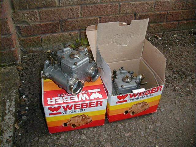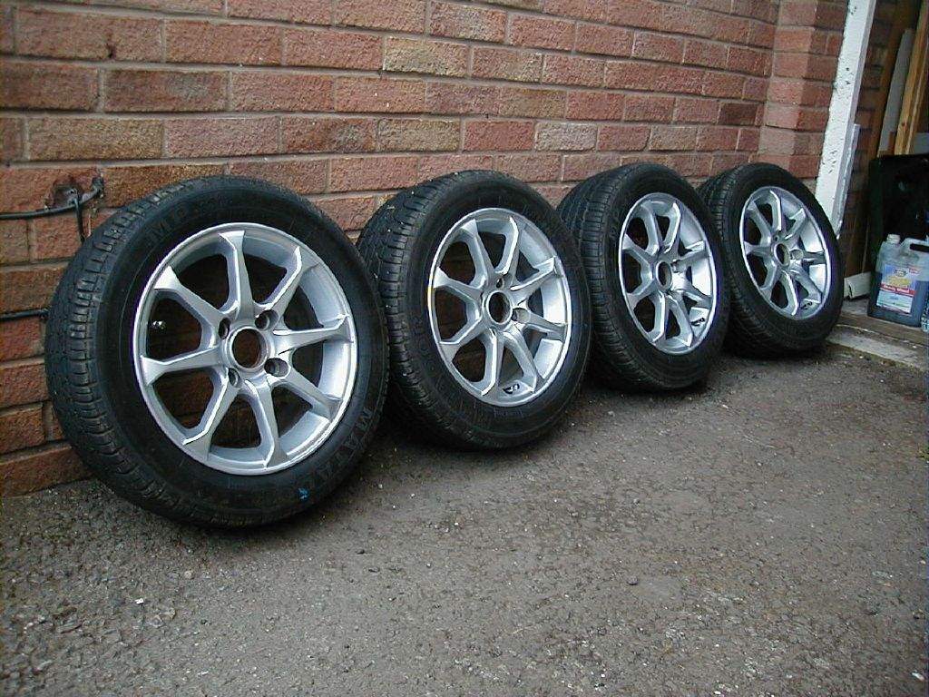 4th August: 1h30m: Changed outer driveshaft boots. 6th August: 1h30m: Modified left hand Fiesta upright with the angle grinder. This was hard work, and it was rather hot seeing as we had temperatures in the low 30s all week! Finished the cut with a file to give a nice smooth finish. 7th August: 1h30m: Modified right hand Fiesta upright. It was still hard work! 8th August: Collected twin Weber 40 DCOE carbs, found on findit for £100. 11th August: 1h00m: Checked what jets, chokes and venturis the carbs were fitted with. 32mm chokes should work OK for starters, as will the 140 main jets, F16 emulsion tubes, 4.5 venturis and 40 pump jets according to Dave Andrew's carb jetting utility. I only have 3 air correctors (!), but they need changing from the fitted 140s anyway, as will the 45F4 idle jets. 15th August: Took uprights to local garage to get new wheel bearings fitted. 17th August: Collected build stands from a wscc member. 20th August: Collected uprights complete with new bearings. 21st August: 2h30m: Modified the rear brake caliper brackets with the angle grinder. You need a fairly steady hand to do this, taking off too much is not a good idea. I erred on the side of caution, and then finished off the cuts with a file. To check, the discs need to be fitted to the hubs, and the brackets bolted to the uprights. The brackets need to sit centrally over the discs. 24th August: Won ebay auction for a set of wheels & tyres. This is how they should look: 25th August: 4h30m: Painted front and rear calipers & brackets, steering column, and fiesta uprights & driveshafts. I knew those build stands would come in useful for something... 27th August: Alloys arrived from Rochford tyres. I'm pleased with the look of the wheels- I think they'll suit the Mojo well. Tyres are only el-cheapo Matadors, but they'll get me on the road, plus they're one of the acceptable sizes- 185/55 R14s. I plan to swap the rear tyres for 195/60 R14s at some point in the future. Total time spent during August: 8h45m