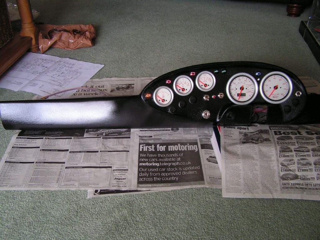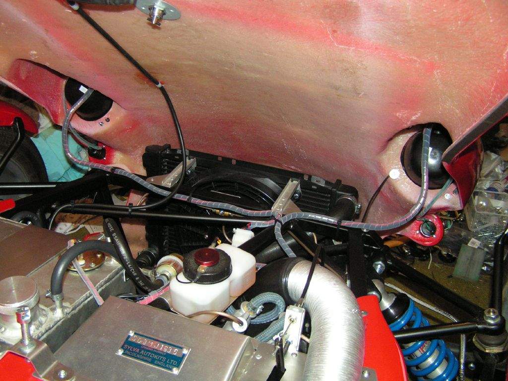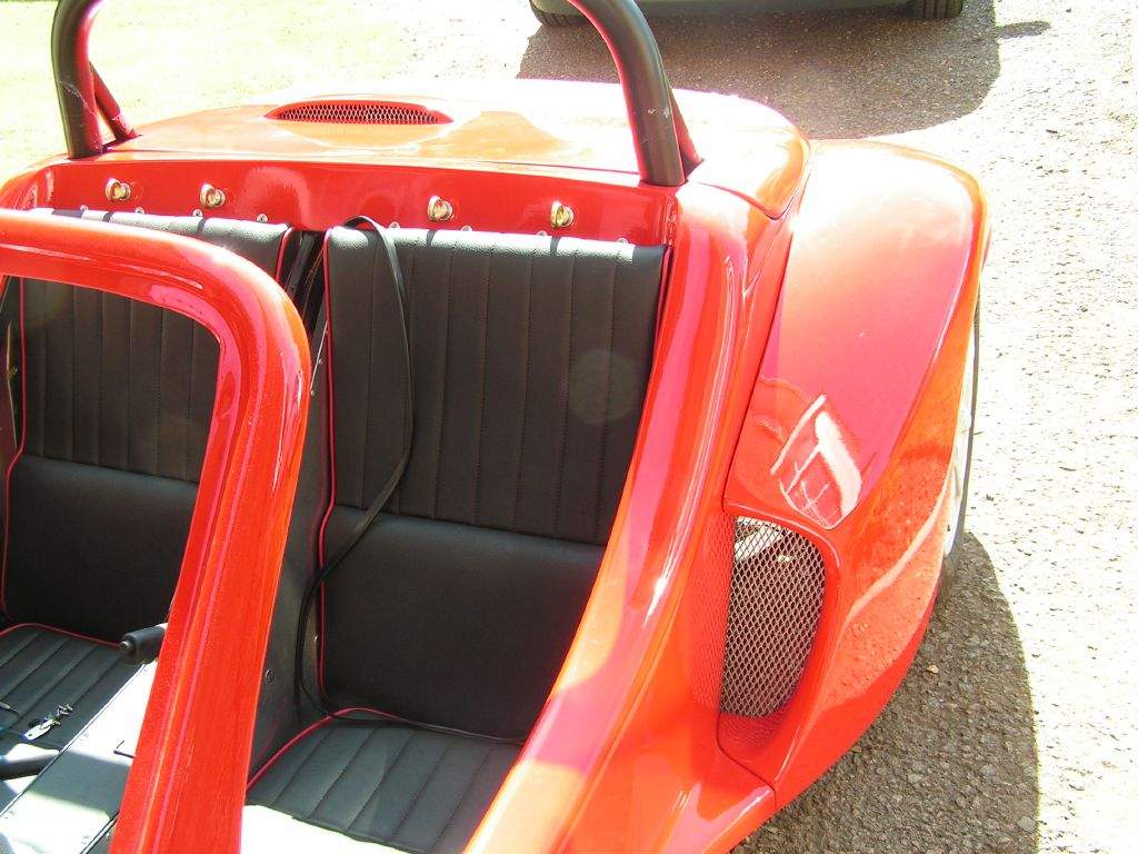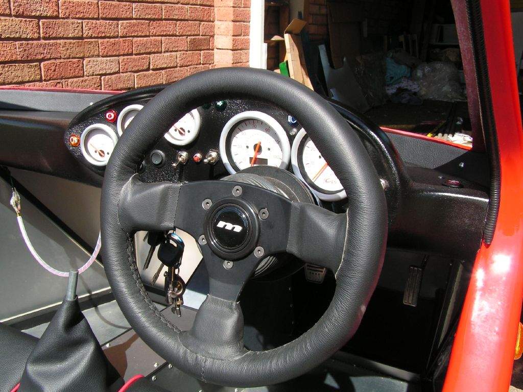 1st August: 6h00m: Blimey, it's August already! I'm hoping to get the car finished this month, so the next few weeks will be manic. Checked that the dashboard was dry, and then began re-assembly. This was a frustratingly time consuming process, but eventually, all the gauges, switches and warning lights were back in place. Made an attempt to set up the tracking more accurately. I did this in the garage so that the floor was roughly level, setting up a string line down each side of the car, parallel with the centre line of the chassis. I then used the string as a reference to measure to the front and rear edge of each wheel rim. To start with, I've simply set the car up with approximately zero toe at all four corners- in the long run, the front in particular will need fine tuning. As for camber, I just checked visually that things didn't look too wild, and will get this set properly post SVA. Fitted the wiper motor to the tub, having finalised how it is being wired up. I've had to abandon my original plan of using the intermittent function, so it will now be a simple 2 position switch, one being the 'parked' position, the other being a constant speed (since mine is a 2 speed motor, I can connect either the 'fast' or the 'slow'- I've gone for 'slow' for the time being, but a change is just a matter of scrabbling about under the dash to change over one connection). I moved on to paint the insides of all four wings with 'liquid rubber', bought from B&Q. This should help to resist star cracks appearing in the body as stones are thrown up onto the lower surface. Last jobs of the day were to wire up the rear number plate lights and fog light. 2nd August: 3h30m: Applied some black sealant to the driver's side in-fill panel, to help keep out stuff thrown up by the rear wheels. Also sealed the join between the body and the floor panel by applying a thin bead along the outside. At this point the heavens opened so a quick retreat to the garage was made. Decided that the next job was to get the dashboard installed, so that I can get the engine running again to check everything seems OK before putting the rear wings on. Paranoid about scratching either the dash or the body, I depleted the world supplies of bubble wrap... I knew that this task was going to be a pain, and so it turned out! Because I have mounted the battery isolator switch on the dash, I have to run the main battery cables behind the dash, and getting these into position is a pain. I ended up with the dash more or less in the right position, but angled so that the dials were pointing skywards. I then managed to manoeuvre myself into the footwell with my head under the dash, legs hanging over the roll-over bar- mmmm, comfortable! I was still having to work in a very limited amount of space behind the dash, but managed to get things connected up. The trouble was, the dash was then reluctant to be moved into its final position, but with a bit of fiddling, it went into place. I just need to try and check that no cables are being squashed- I think getting the dash back out again, especially after the screen is fitted, could be very difficult! 3rd August: 3h00m: Phoned intatrim to chase the delivery of my seats- they should arrive tomorrow! Had a further look at the dashboard, and decided I needed to re-route one of the battery cables... So, the dash came out again! A couple of hours later I was happier with the result, so you can imagine how my heart sank when I connected the battery and one of my circuits was dead. I went inside and ate my tea whilst trying to stem the flow of steam from my ears! Returning to the garage, determined to get the dash finally fixed in place, I once again took up the 'footwell position' and tried to check the wiring without removing the dash again. Hey presto, a connector had mysteriously separated itself from the fuse box. Pushing it back on, it was clear that the connector in question had lost its grip on the blade of the fusebox, so a quick squeeze with the pliers and all was sorted. Phew! Everything now seemed to work OK, although I haven't yet connected most of the external lights (at the moment, side repeaters, a rear fog light and 2 rear number plate lights are the only ones). Before going any further, I wanted to check that the engine ran OK. I had not yet run the engine on the new fuel line I put in quite a while ago, plus the engine had been sat for a couple of months without turning over, so it seemed a sensible thing to check before I started bolting on more things. So, I turned the key to get the fuel pump running, doing so repeatedly until fuel had reached the carbs (those clear fuel filters are useful for checking this). Then, I went for it and turned it over. A couple of coughs and it roared into life and settled to a good idle! Excellent! I left it running for 10 minutes or so, and everything seemed OK. The bulkhead seemed to stay a little cooler with the heat reflective mat fitted, the stat opened, and the temp was heading towards 90 degrees when I switched back off. With those successes behind me, I fitted the heater vents and distribution box to the dash, followed by the trim piece I made a couple of weeks ago to fill the gap between the dash and the body. It is now starting to look pretty nice! (even if I do say so myself...) 4th August: 1h30m: Seats arrived between me leaving for work and Liz leaving for work, so I'm now going to send off the the SVA form! I've requested 20th August as a test date, so let's see what happens... Once I got home, I unpacked the seats and tried them in place- they look great. Pushed the car up onto my wooden ramps to allow me to run a bead of sealant along the join between the tub and floor panel on the passenger side, and also sealed around the infill panel. 5th August: 4h00m: Covered the tunnel top panels in foam and vinyl, and glued the gear lever gaiter that Mum had posted back to me onto the surround before bolting it to the tunnel panel. A quick measure o