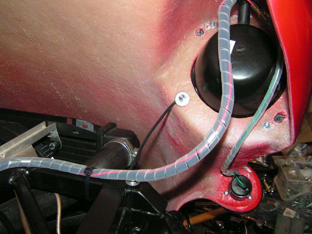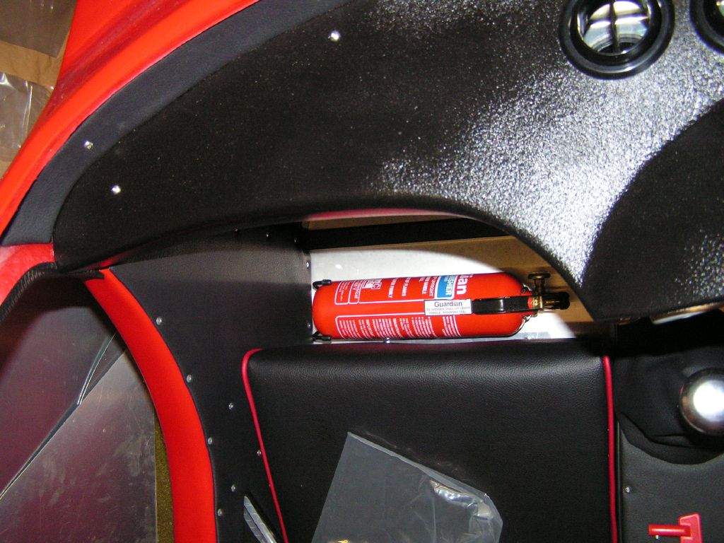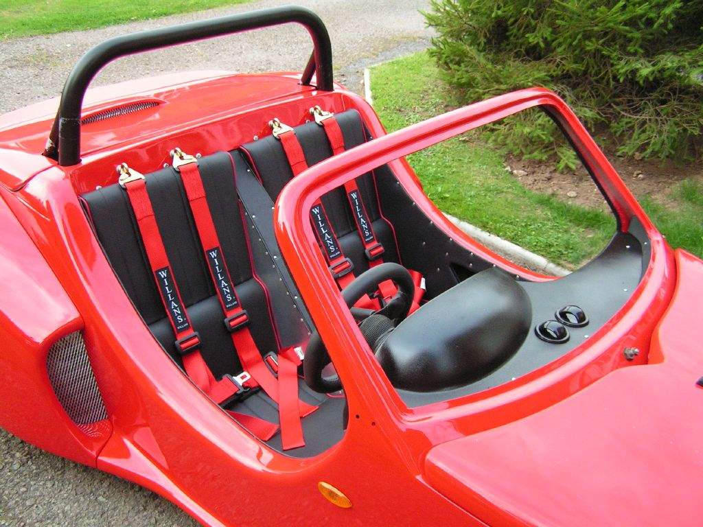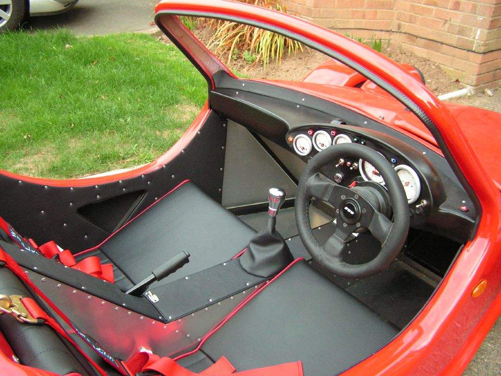 The problem is that you can't adjust the cables with the handbrake lever in situ, so you have the joy of putting it all back together to find out you've tightened things up too much or not enough! In my case, after refitting the lever for the third time and still finding out it was dragging, I was fed up so gave up and went to bed! 6th August: 3h30m: I had the day off work today, so it turned into a bit of a Mojo epic! First job was to fit the nearside rear wing, so up on the trolley jack and off came the wheel. With the wing fitted (which takes a surprising amount of time, it's about 13 nuts and bolts, and access is a bit limited...) I decided to do a few other jobs inside the wheel arch! So, I cut out a section of the aluminium grille mesh I had bought for the job, and fitted to the rear wing intake. I fitted this by inserting a rivnut into the 'infill panel', and then bolting through the mesh. Fitted the rear lights to the wing, and wired them into a multiplug connector to join into the main loom. I then ran a little bit of sealant along the join between the tub and the wing from the underside. This will fill a few very small gaps that have not been taken up by tightening the nuts and bolts, just due to small variations in the surface of the mouldings. It will stop road wetness & grime from seeping through, and just generally seemed a sensible thing to do for 5 minutes work. I then switched back to the driver's side, and did the mesh, lights and sealant on that side. Unwrapped the engine cover for the first time since it returned from the sprayers, and fitted the lock barrel and securing pins. I then fitted some adhesive-backed foam strip around the edges, to prevent the cover from rubbing on the main tub. Unwrapped the bonnet, and fitted the grill mesh to the opening for the radiator. I cut the mesh about an inch too big all around, and carefully bent the edges over the return edge of the moulding. I secured it in place with copious amounts of clear silicone sealant. I just had enough mesh left to fit to the engine cover air scoop. Afterwards I realised that I actually need some more to do the little openings at the rear of the car, but I don't want to buy another sheet of the stuff for the sake of those 2 little cut outs! I'll have to try and blag someone elses offcuts... Added a small bit of vinyl trim to the inside of the map pocket, and at the same type fixed some beading around the edge of the opening. 7th August: 3h30m: Adjusted the handbrake one more time- this is becoming a pain! This time, the end result seems about right, so I moved on to fit the tunnel top panels into place. This was just a matter of fitting the wing piping along the edges of the panels to give a nice radiused edge- easy to describe, but it was fairly time consuming. Started rivetting the driver's side internal side panel into place. I had been nervous all along about rivetting into the main tub, with the back side of the rivet pulling against the fibreglass, but no problems with this panel. I couldn't resist putting the seat in and attaching the harness at this point! Moved on to the opposite panel, and with the first rivet- a mini disaster! I had deliberately started once again with the rivets into the tub just in case I had a problem, and in this case my worst fears were realised- a small crack appeared in the surface of the tub just as the rivet popped. Grrrrrrr. I drilled the rivet out, which allowed the crack to close back up, which was better, but I'm still a little frustrated! I decided to cover the crack (it's only very small) with a small dab of paint, as I had the remains of the tin that had been used when spraying the car. I then had a think about what to do to stop the same thing happening again. I was definitely not going to pop another rivet in the hole where the crack formed, I would fix an un-popped rivet with adhesive, but I wanted to rivet through the remaining holes. The problem seemed to be the amount of force needed to pop the rivet, so I had a trial with an offcut of fibreglass, where I deliberately weakened the mandrel of the rivet using tin snips before inserting into the rivet gun. This seemed to work, I needed to apply less pressure to pop the rivet, so I used this idea on the remaining rivets that passed into the tub. Whether I was just unlucky with the one rivet I don't know, but I had no further problems. It's just annoying that I had one problem rivet. My advice to Mojo builders is to either deliberately weaken the rivets as I did, or use some other method of fixing the panels to the tub. I think it is important that they are attached, as they give a lot of extra support to the tub when people are climbing in and out- but rivetting into fibreglass does seem to be asking for trouble to some extent... Thankfully the cracking I caused was fairly minimal, but others might not be so lucky! 8th August: 4h30m: Finished rivetting in the left hand outer trim panel to the chassis rails, and glued in the rivet that had caused all those problems yesterday. I just hope that the small crack in the gel coat and paint doesn't get any bigger... Fitted the passenger harness & seat- the interior is starting to look rather good now! I had spent some time earlier in the week deciding how to do the windscreen wash. Jeremy Phillips generally straps the washer hose directly to the wiper arm, with a restriction in the end of the tube to slow down the flow of water. However, after a bit of fiddling with this idea, I decided that I wasn't happy with the amount of slack I would need in the tube to allow the wiper to, er, wipe. I'm trying to build the car with a very clean, uncluttered look, and a big loop of washer pipe didn't really conform! So, after conferring with Steve Knee, I have decided to use a normal washer jet mounted on the bonnet. I had wondered if this might be a very good way of giving the occupants of the car an instant shower, but Steve reports no such problems, so I've decided to give 