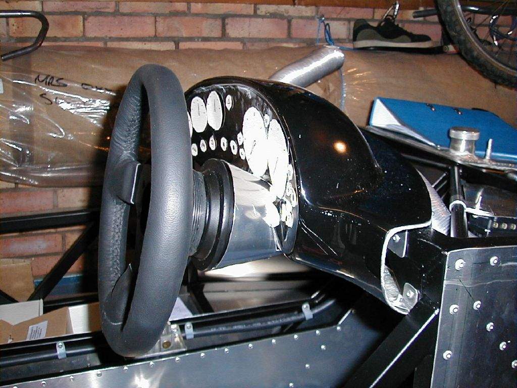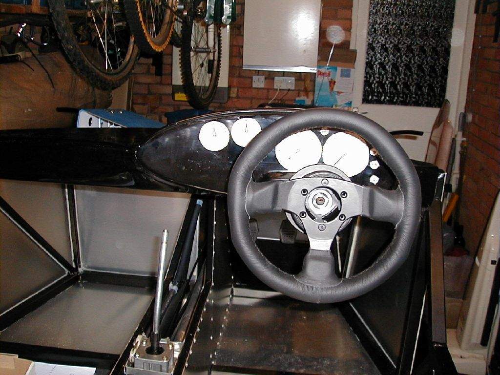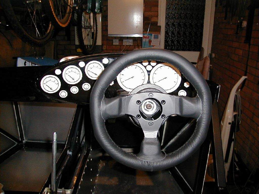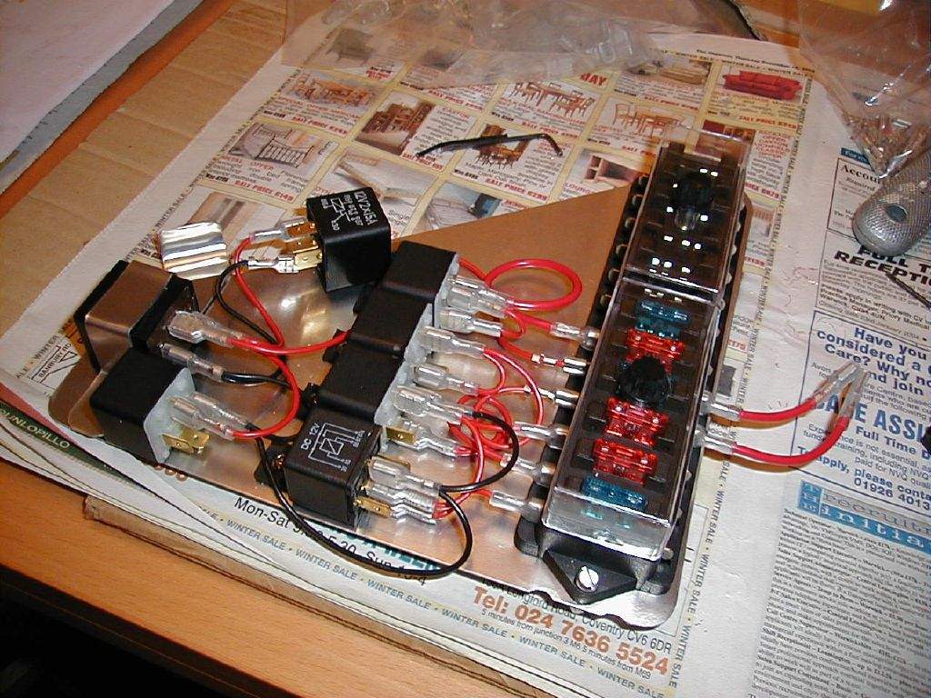 the dash. 15th December: 2h00m: Ordered a load of wiring stuff from vehicle wiring products, and also ordered my dash instruments. Finalised where and how I was going to mount my fuse box and relays (after giving this a lot of thought for the last few days!), and began making up the brackets and mounting plate. I've decided to locate these above the drivers footwell, with access from inside the car, so that my cable runs from the dash to relays and fuses will be short and (hopefully) neat. The mounting plate will be bolted on using rivnuts, so I'll be able to drop the whole lot down for easier access should any major wiring gremlins set in. 16th December: 1h00m: Too cold to work in the garage so spent some more time scribbling wiring diagram plans. I had been debating whether to use some kind of column stalks to reduce the number of switches on the dash, but I have now decided to go for the true kit car approach and use a combination of toggle and rocker switches. SVA regulations will only allow the use of toggle switches within a specified zone, within a certain radius of the outer edge of the steering wheel. However, because the Mojo dash moulding has a relatively small area for mounting switches, it mostly falls within this zone. See an SVA manual for more details... 17th December: 1h00m: Took some measurements for my planned steering column surround. I want to fill the gap between the Mountney boss and the dash, so a cone shape seems to be the obvious solution. I decided where I wanted the cone to taper to, and then returned to the warmth of the house to draft out a pattern using simultaneous equations and some other maths stuff. The proof of my correct maths will be when the aluminium gets cut out! 18th December: 3h00m: Getting close to finalising my wiring diagrams, so decided it would be good to have an electronic version- easier to read, and easier to make minor modifications to without turning the diagram into a mess (which is what tends to happen with pen and paper based diagrams!). Here's the result: 19th December: 3h00m: Cut out the aluminium sheet for the steering column surround, and then formed into a cone shape and secured with 2 rivets. The pattern I had drawn out included a pessimistic cut out to fit around the lower edge of the dash, which I then had to gradually cut back further until I was happy with the fit. This was a slow process! I then made up a bracket to connect the new surround with the lower two mounting points on the Sierra column- more fiddly stuff. Connected the surround to the bracket with a dome-headed bolt threaded into a rivnut. I'm really pleased with the result - it looks good enough to leave to leave uncovered (I had expected to have to paint it or cover in vinyl). Wiring stuff and dash instruments also arrived: 20th December: Bought my switchgear! Here are some samples: 22nd December: 2h30m: Cut out some more accurate templates for the gauges, switches and warning lights, and then had another attempt to fit them all on the dash! The dials are a little larger than expected (90mm &55mm dia) so I'm struggling a bit to fit everything on, whilst keeping everything visible from the driver's seat. The hazard switch has been relegated to the dash top to the right of the main instrument pod. Began to make a mounting strap for the flasher unit, the only one of my relays that doesn't have an integral mounting hole. 23rd December: 2h30m: Began mounting relays onto the mounting plate. Whilst fitting a 4mm rivnut, I broke the mandrel... Hmmm. Had a practice with the crimp tool, it seems to produce good quality crimps. 24th December: 2h30m: Began wiring up relays and fusebox. Since I've mounted these to a removable plate, I could work in the comfort of the house! Also phoned Laser Tools- a replacement rivnut mandrel will be in the post! 29th December: 2h30m: Continued wiring the fusebox / relay board – indoors! 30th December: 2h00m: Finished as much wiring as I could from the comfort of the house, and then mounted the fusebox / relay board onto the chassis. Thought for a long time about my earthing points- where to put them, how to do them? Decided to have a 'front end' earthing point mounted to the upper side of the pedal box, which would serve for all the front lights, fuel pump, heater blower, horn, fuel level sender and all relays. I will then have another earthing point somewhere under the dash for dash back-lights and warning lights, and another earth point (or two) somewhere at the rear. The advantage of using the pedal box panel is it is easy to bolt through from one side to the other, compared with mounting onto a hollow chassis member. I actually used 3 connectors from Vehicle Wiring Products, mounted alongside each other. 31