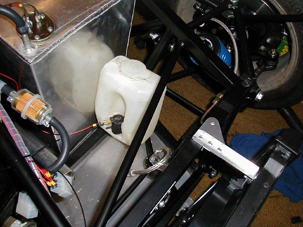 measurements had been accurate enough, and it just fitted. While talking about the nose, I'll talk a bit about the alignment, which is quite difficult without the main tub fitted. From looking at various pictures of other builds, it seems that the lower side edges of the bonnet to the rear of the lamp housings should run parallel with the top chassis rails, and a few millimetres above them (the gap is because the main tub has a return edge moulded to sit on top of the top chassis rails). In terms of fore-aft alignment, I've just been shoving the nose as far back as it will go- this is limited by the fibreglass coming into contact with the upper wishbone mounting bolt, near to the indicator plinths on the nose. Let's hope my assumptions are correct, otherwise I might be re-doing the radiator mounts! With the radiator and fan fitted, I wired up the fan to the cables than I had previously run down to the front of the chassis. Decided to mount my washer fluid tank on the outer chassis upright just ahead of the fuel tank. The tank is from an early Metro, with no rear wash wipe, so has only one pump, which is ideal. A shaping in the rear of the tank enables it to be mounted by sliding onto a bracket in the original Metro installation- I replicated this idea using a small piece of aluminium, which I riveted to the chassis. Total time spent during February: 39h00m