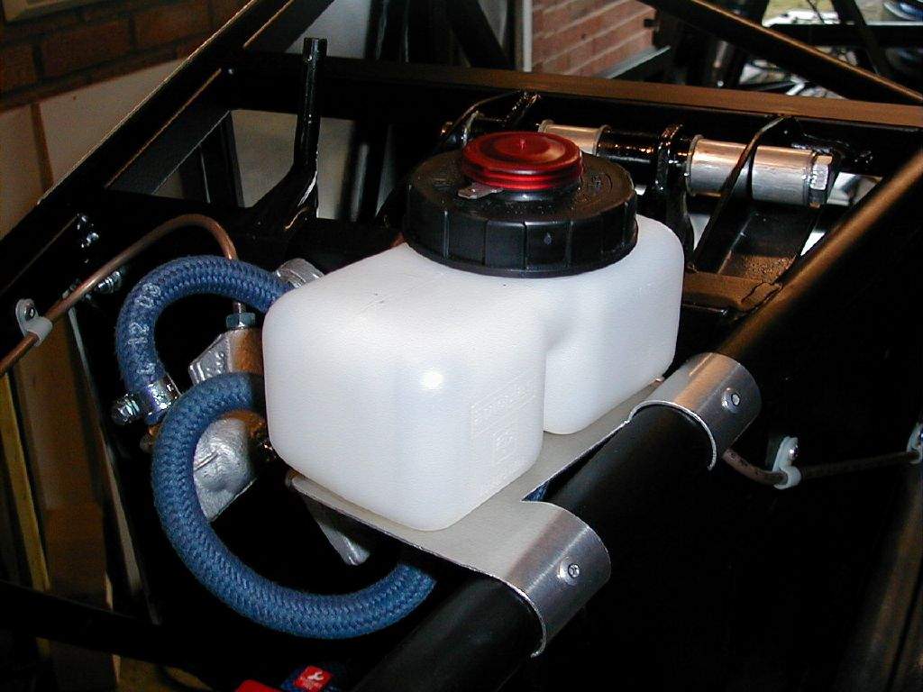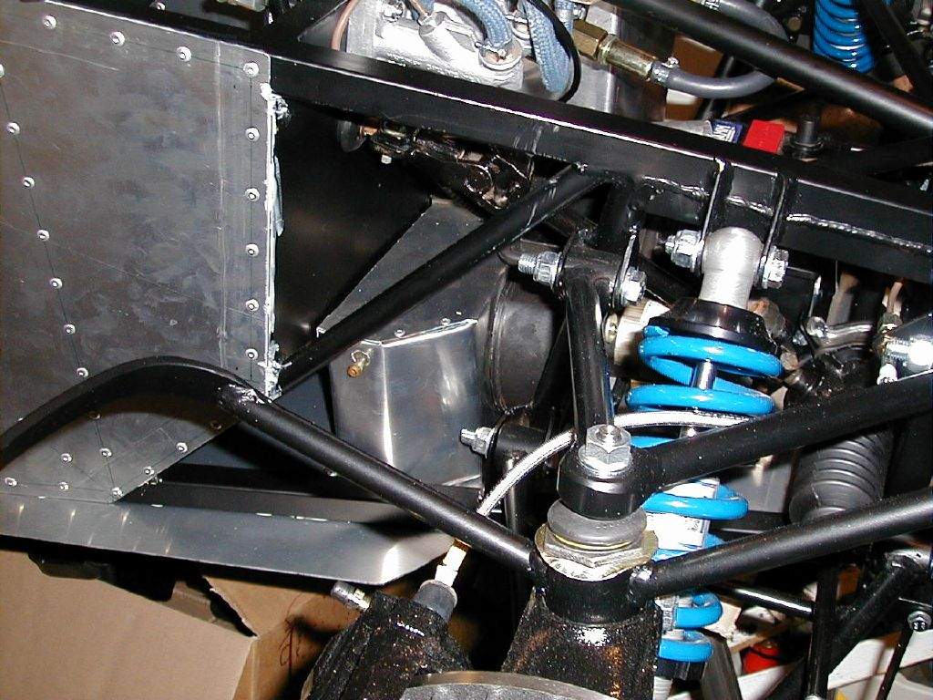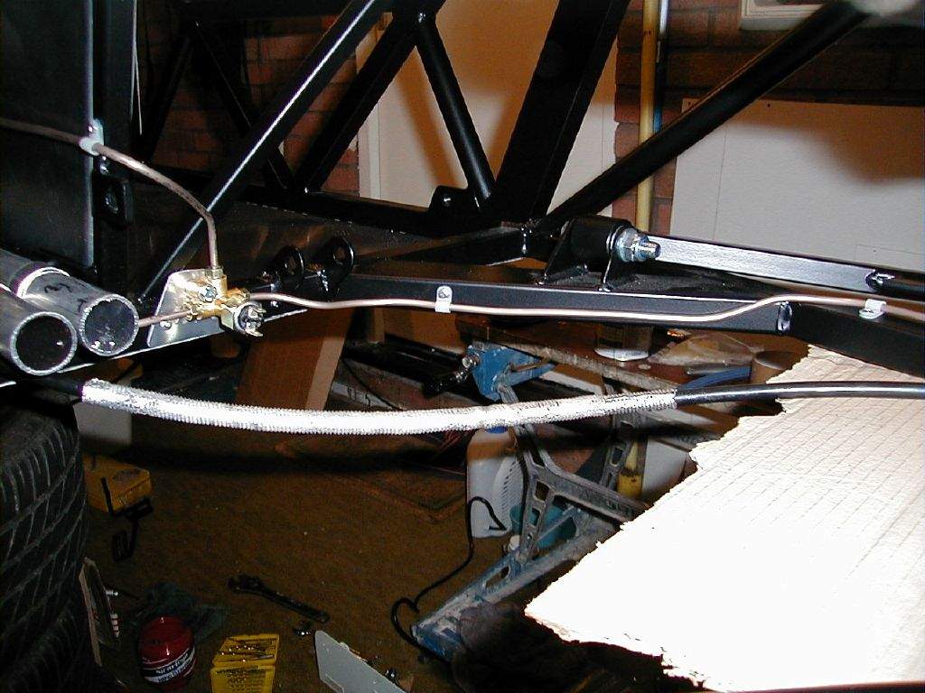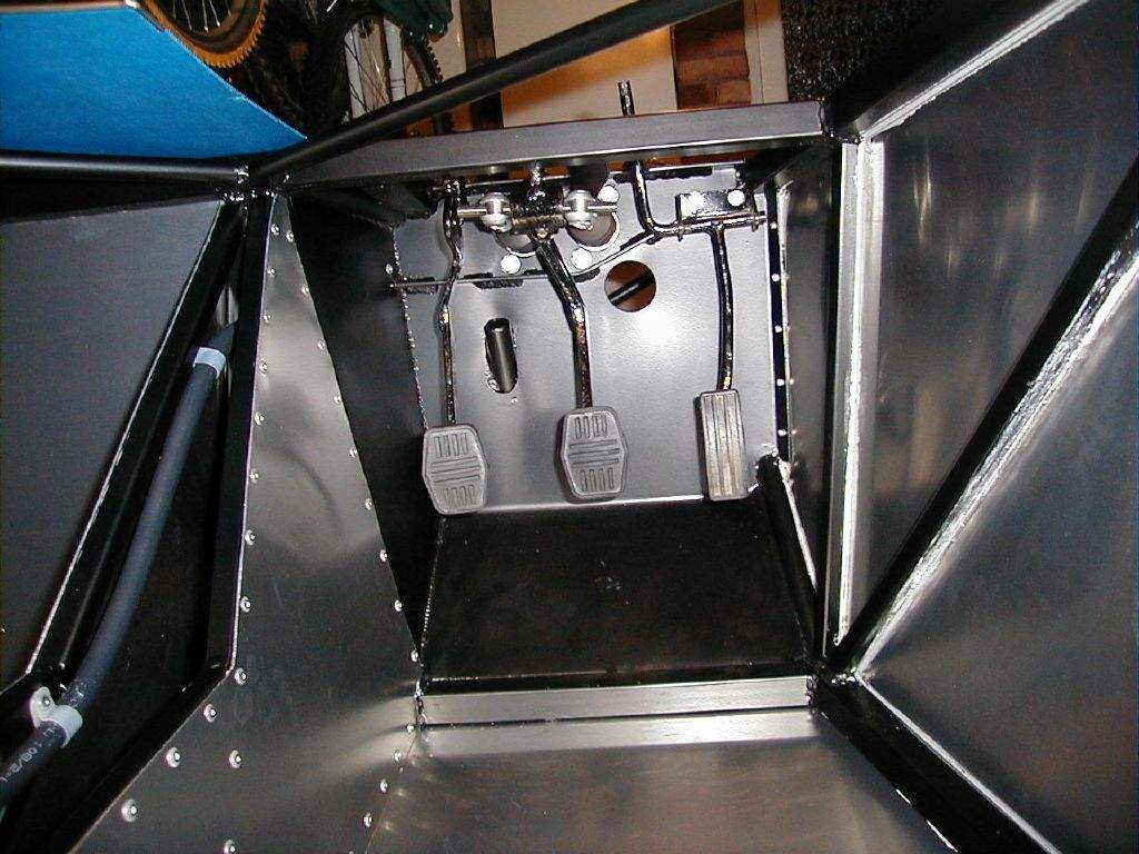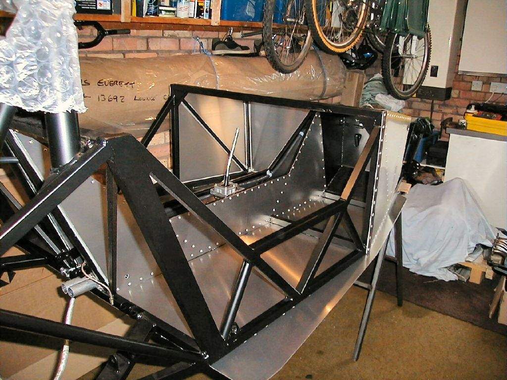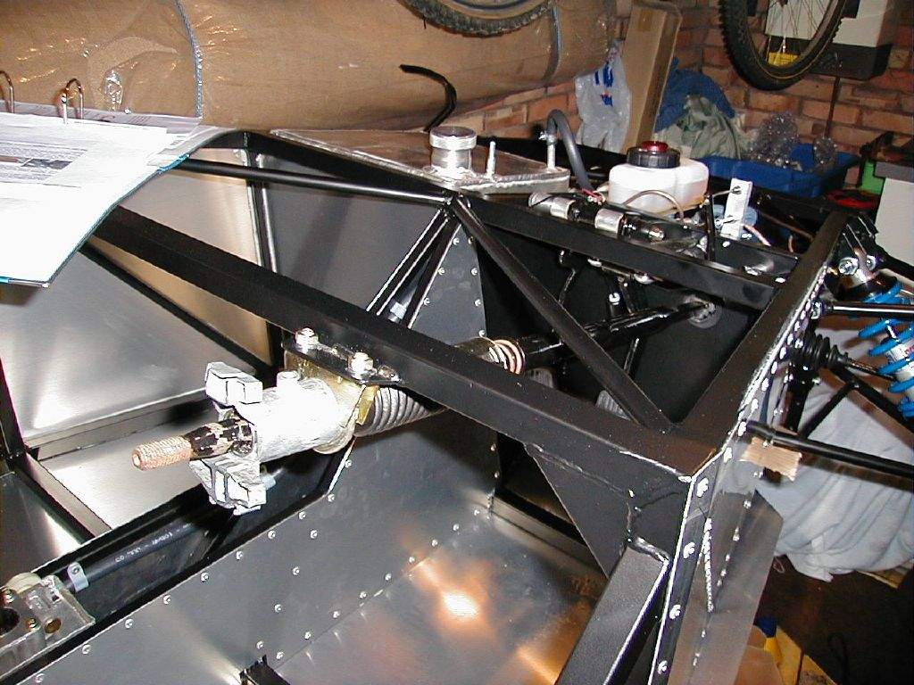 2nd November: 5h00m: The Hammerite was dry enough to start fitting the suspension uprights. I started with the offside front- first step is to fit the top ball joint into the wing stay adapter, then bolt the adapter into the Sierra upright, then offer the whole assembly up to the wishbones and bolt in place. Next, I fitted the steering rack, and then the other 3 uprights, and then the OSF disk, caliper & pads. 3rd November: 0h45m: Had a trial fit of the nose to see if I would be able to use the VW Polo radiator (as many Westfield owners use) that I had bought (on the understanding that I could return it if I couldn't make it fit!). Looks as though it should be possible. Update: The Polo radiator was later returned as I decided it was just too tight a fit. A Maestro 1.3 radiator is very slightly smaller, and looks as though it will do the job- and slightly cheaper as well! Fitted the OSR brake caliper, and realised that I would have to make a very minor mod to the pad back plate to stop them rubbing on the centre section of the brake disk (remember these are Sierra calipers gripping a Fiesta disk, so not as Mr. Ford intended!). 4th November: 1h15m: Fitted the NSF brake caliper, disk & pads. Started work on the front brake lines- one run from the master cylinder to a T-piece on the top front chassis rail, and then 2 runs out to the flexible hoses on either side. 6th November: 0h30m: Worked for a little longer on the front brake lines. 7th November: 2h00m: Continued with the front brake line. This was quite fiddly as lots of bends were required in a fairly restricted area. Made up a small bracket from some scrap aluminium to support the T-piece. Modified the rear brake pad back plates to clear the disks, and then completed fitting both rear brake calipers. 10th November: 1h45m: Started on the rear brake lines. This was another fiddly job, and required another small bracket to be made to support the T-piece. The T-piece also needs filing down slightly to ensure that the brake lines screw in far enough to create a tight joint. 11th November: 1h00m: Painted the pedals. 12th November: 2h00m: Trial fitted the pedals to the pedal box to decide on the pedal spacing. I went out and measured the spacing on my Leon and Liz's Ka as a reference, knowing that I can heel and toe in the Ka, but not in the Leon. 2¼" seems to be the gap required between the brake and accelerator, so that's what I went for. The clutch pedal was spaced to centralise between the brake and the tunnel. With spacings decided, I made up three aluminium spacers from a short length of aluminium tube that came with the kit- these dictated the positions of the brake and clutch pedal. The throttle pedal is mounted on it's own pivot, which required the end plate of the footwell to be drilled to suit. 14th November: 0h30m: Began making a template for the brake fluid reservoir bracket. 15th November: 3h30m: Continued making the bracket for the brake fluid reservoir. This was a fiddly job but I'm pleased with the end result. Moved on to fit the handbrake cables. Fitting the end of the cable to the lever on the caliper is a difficult job, they are not designed to come back off in a hurry (I remember that removing the cables from the original calipers in the scrap yard required a lot of brute force!). Zip tied the cables to the lower wishbone and fed around to the rear of the tunnel. As instructed in the manual, I didn't connect to the handbrake as yet- the brake system needs filling and bleeding first. Removed the two radiator pipes from the tunnel to form the required bends- again, lots of brute force required! 17th Nov: 1h00m: Spent some time working out how to package my newly acquired heater matrix and blower (from a Fiat 126!) I don't want to mount to the front end of the tunnel (inside the cockpit) as I think this looks ugly, and I don't think I'll have room to mount it slung below the front scuttle without it hanging down into view. So, I'm looking at the possibility of locating it in front of the driver's footwell, and moving the battery to a central position slightly further forward in the nose. I wasn't too happy with the battery just in front of the footwell as the clutch cable gets in the way, so this seems to be a better solution. It will mean ducting the resulting hot air over the top of the pedal box, but I think it might just work. I'll need to fabricate a new housing for the matrix and blower, to suit the new location and orientation. 18th Nov: 1h15m: Made up a bracket for the throttle cable and throttle pedal top-stop from aluminium extrusion. 19th Nov: 1h00m: Package arrived from Sylva containing my sump, lower steering column and fuel tank. I was straight on the phone to Jeremy as unfortunately the sump had been modified incorrectly: the wrong corner had been removed! Jeremy couldn't believe his mistake, but a second sump will be on its way soon. Tried the fuel tank in place and trial fitted the steering column to make sure it all went together well (I'm paranoid after the sump 'issue'!). The lower column will need removing again for painting. 20th Nov: 2h00m: Trial fitted my second attempt at a radiator- this time from a Maestro 1.3 as suggested in the build manual. It is still going to be a fairly tight fit, but it's been done before, so should be OK. Came up with a pattern for the new heater housing, and began to cut out of 20G aluminium panel. I'm trying to make this out of a single section with multiple folds.... Not sure whether I'll be successful, but decided it was worth a try! 23rd Nov: 3h30m: Finished cutting out the heater housing, and then began making all the folds. This was hard work, but my calculations and measurements proved to be accurate enough- the heater matrix fitted well. I then cut out a hole in the housing to suit the blower unit, and then mounted this in place. It's all a tight fit in the front- but that was part of the challenge! 24th Nov: 3h00m: Fitted the heater unit in place- it is attached