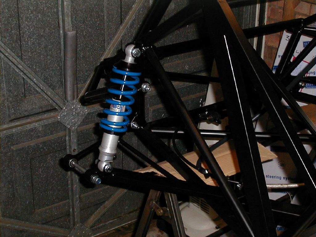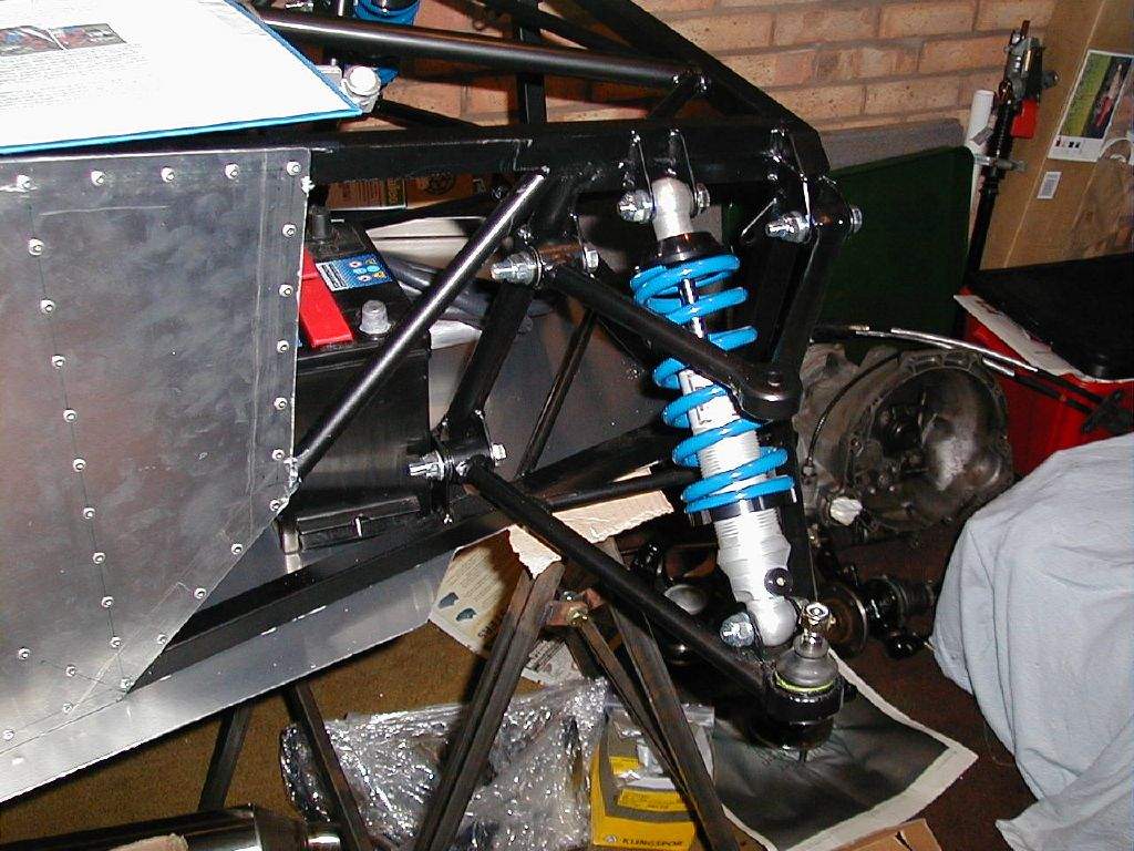 As the next job would be to start fitting the suspension, a few parts required painting- the front uprights that were new from Sylva and the 4 rear upright adapter brackets. I also painted the two gear linkage rods. Then I began the exciting job of fitting the suspension. All of the suspension wishbones (2 at each corner), and four spring-damper units were bolted in place. This made a big difference, visually. It was beginning to look like it might become a car one day!