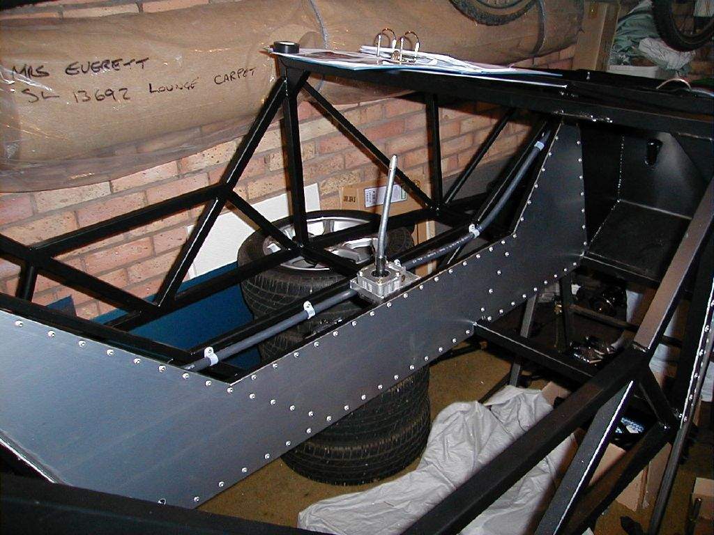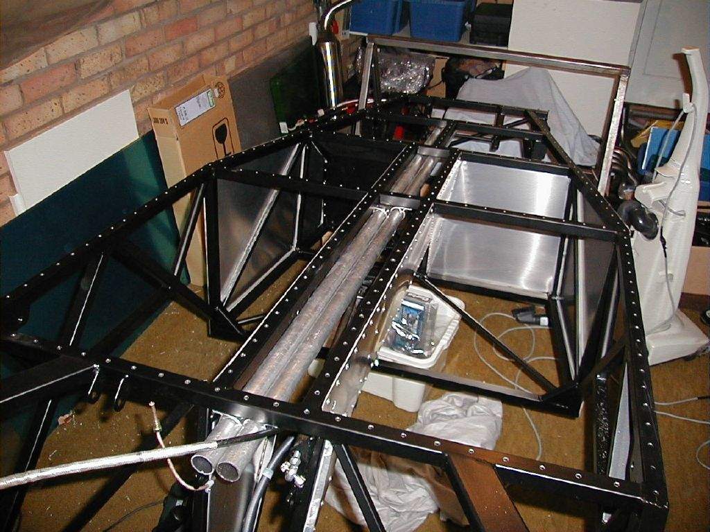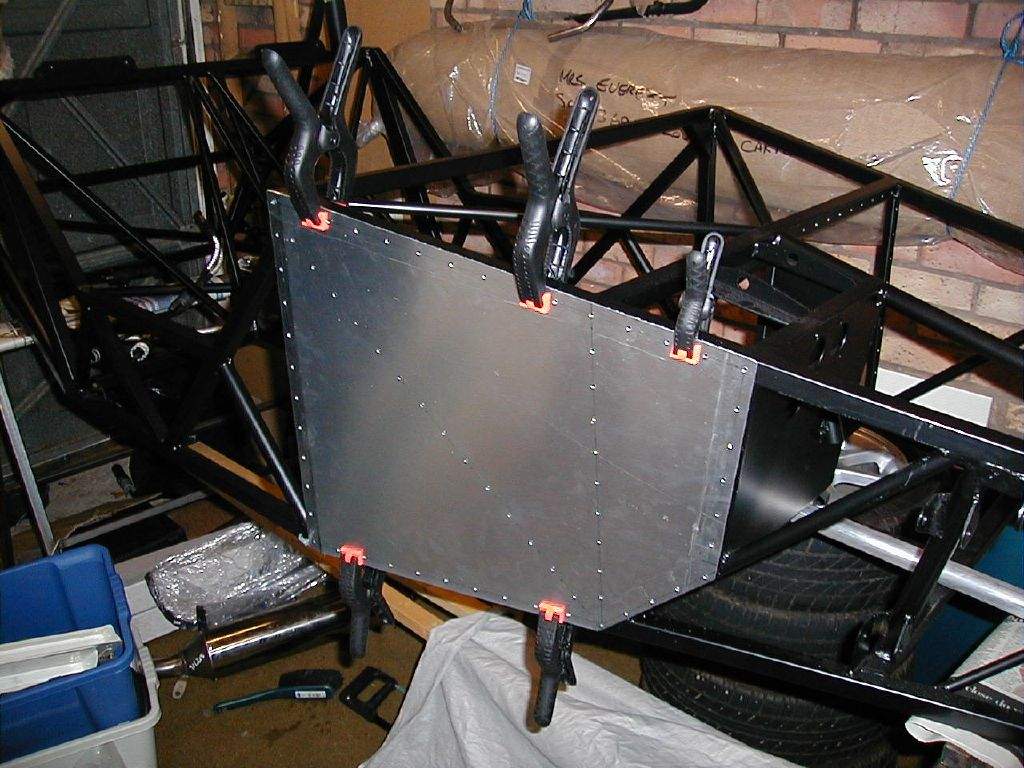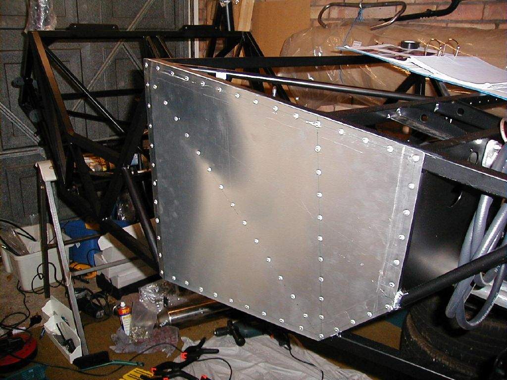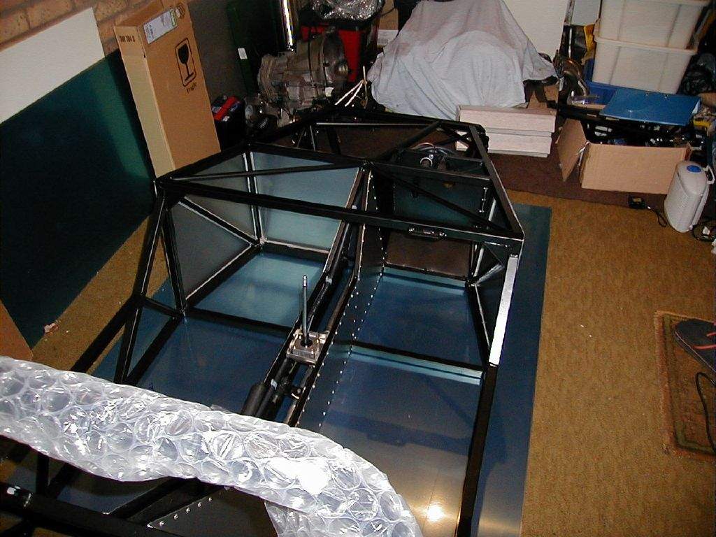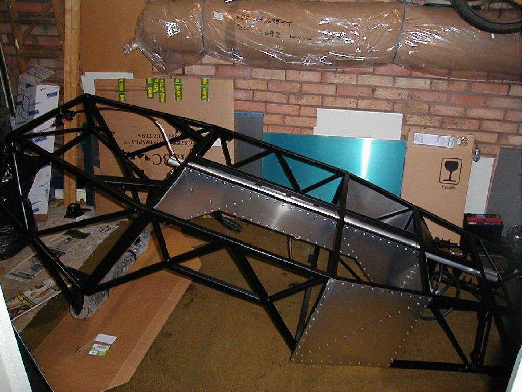 Finally, I felt the urge to rivet my first panel into place. Although not strictly in the order suggested in the build manual, I decided that I could safely fit the driver side outer footwell panel (I still need full access to the tunnel for another job or two), so applied a bead of car body sealant to the chassis members that the panel will fit against, offered up the panel and pushed the rivets into position. Then I got 'popping'! 26th October: 6h00m: Final job in the tunnel for now was to sort out the cable stop for the gear linkage. The Focus-based linkage I'm using will translate the fore-aft motion of the gear lever to the gearbox using a rod, whilst the left right motion of the gear lever is translated to a push-pull motion on a cable. I used an angle grinder to chop down the huge original steel bracket from the Focus, to give a neat cable stop that I then drilled and bolted to the plate in the tunnel. Although quite a few more bits and pieces will have to be routed through the tunnel (heater hose x2, throttle and clutch cable, loom…) I decided that these will not need to be fitted as securely, so I'll be able to fit these through the removable tunnel-top easily enough. Before fitting the panel to the tunnel I drilled a hole to correspond with the harness mounting point in the chassis. Then I carried out the panel-fixing procedure as before- sealant then rivet. Unfortunately one slip of the rivet gun resulted in a bit of a scratch on the panel. I was MAD! Maybe it'll improve with some fine wet & dry paper followed by a polish, but this car is all about driving after all, so I'm sure I'll soon forget about it! Hopefully… 27th October: 1h30m: Riveted the passenger side tunnel and footwell end into position. At this stage I ran out of rivets, so a shopping trip was called for! I reckoned I would need at least another 400 rivets, maybe I missed a bag when I picked up the kit from Sylva. Anyway, no problem, I picked up 1200 rivets for £15- that'll definitely be enough! 28th October: 2h00m: Measured, cut out, centre punched and drilled the passenger side outer footwell panel. 29th October: 2h30m: Riveted the passenger side outer footwell panel in place. Negotiated some assistance from Liz to drop the chassis off the build stands and onto the floor panel, which itself was sat on the floor. Once the chassis was centred correctly, I drew round all of the chassis members with a marker pen, and marked what will be the finished outside edge of the floor based on some dimensions from Sylva. Then I sat in the car for the first time! It now looks very small and low compared with when it was on the build stands. Dragged Liz out to the garage once more to help pull the floor panel out from under the chassis, and then turned the chassis completely upside-down ready for drilling and riveting the floor panel in place.
