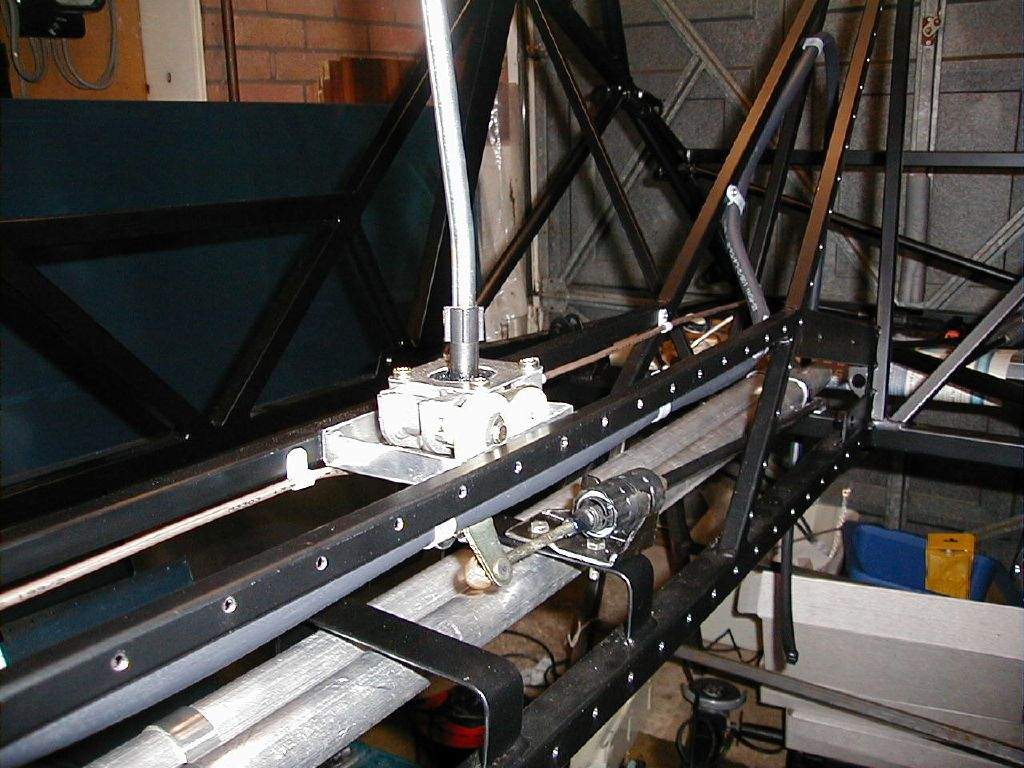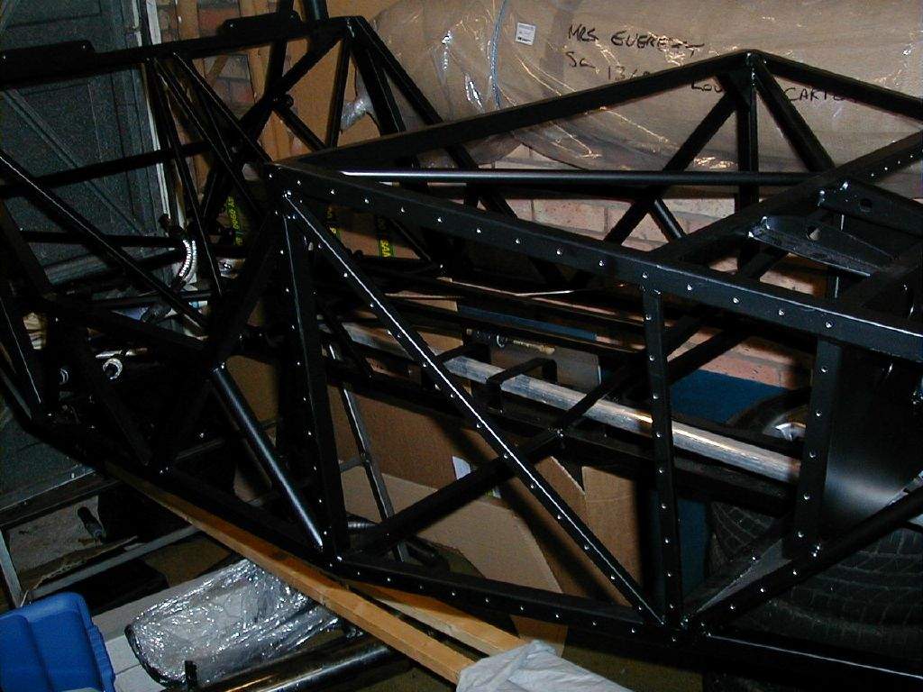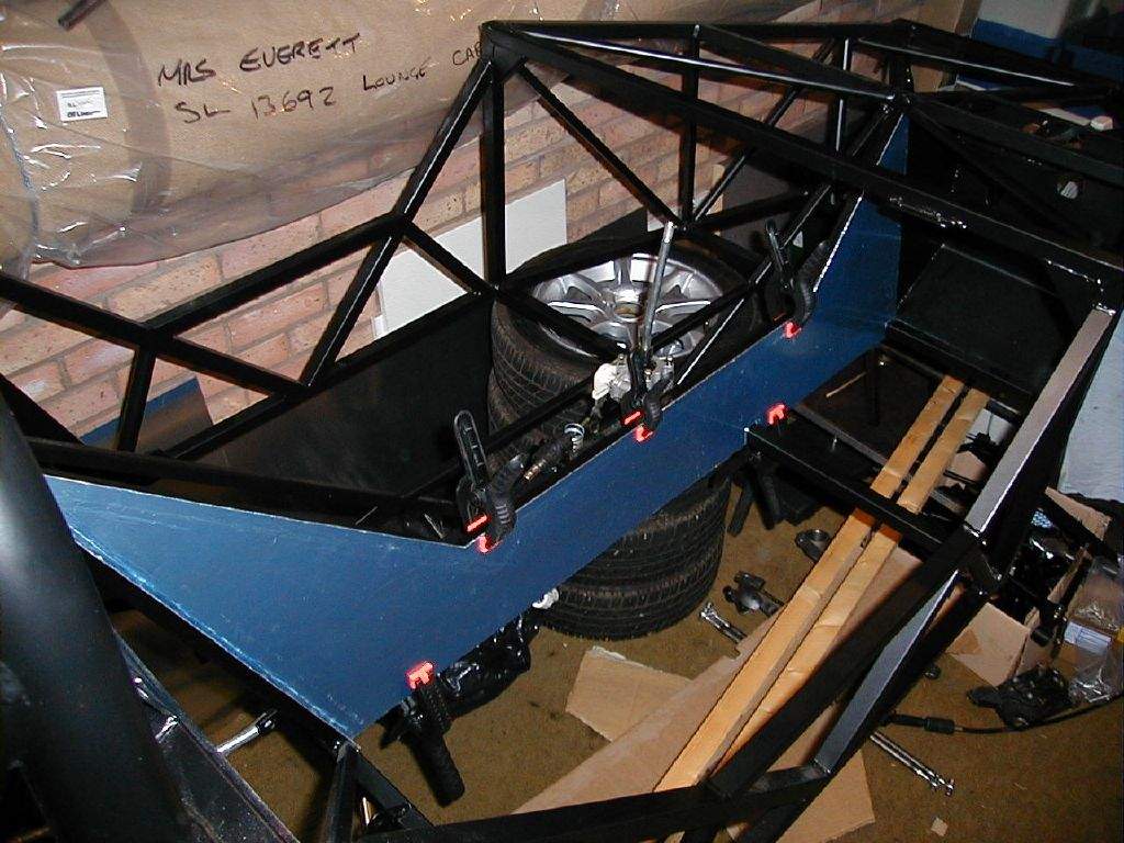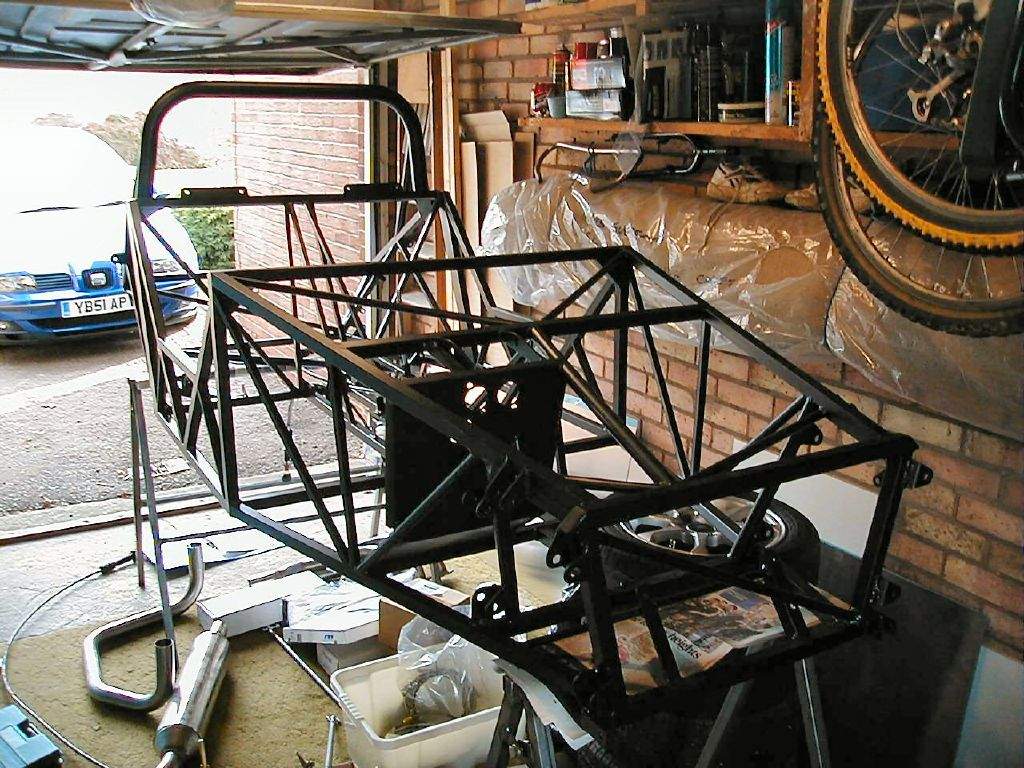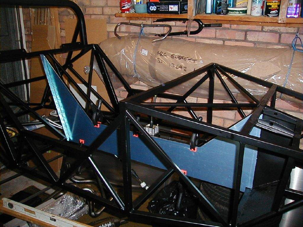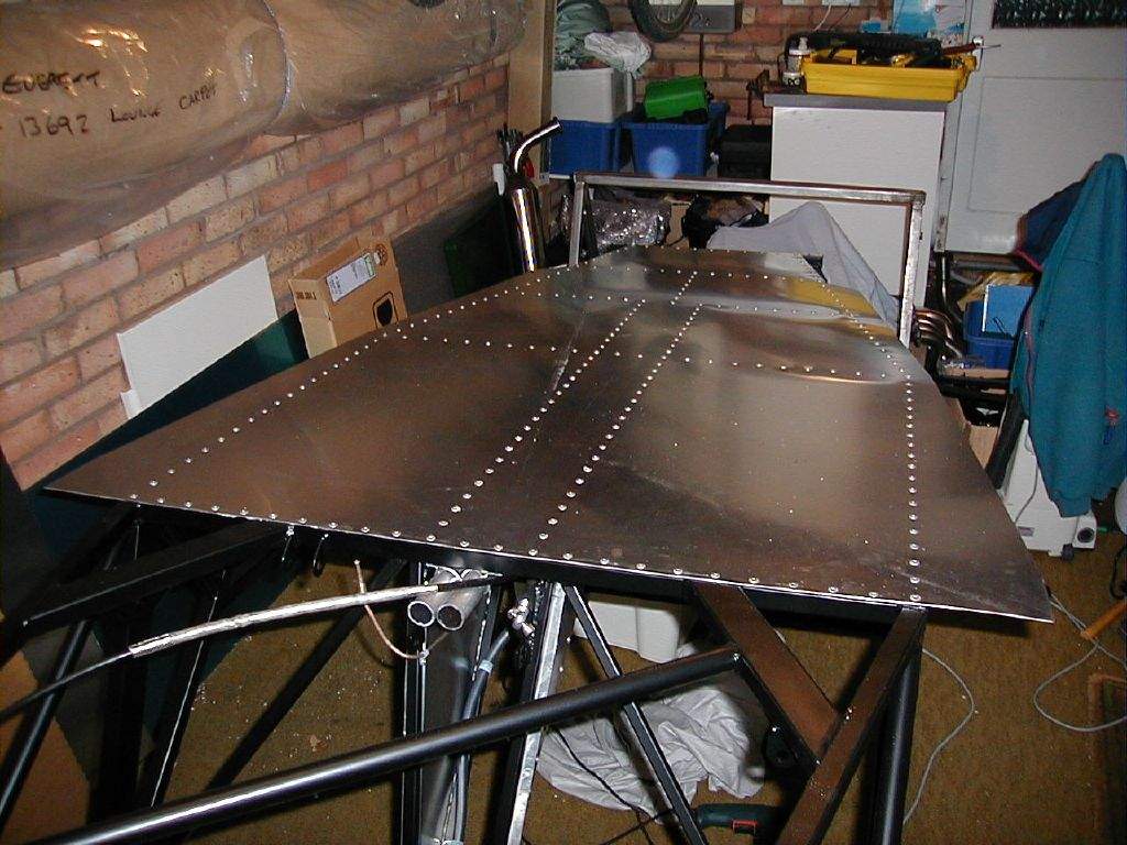 Finally, I felt the urge to rivet my first panel into place. Although not strictly in the order suggested in the build manual, I decided that I could safely fit the driver side outer footwell panel (I still need full access to the tunnel for another job or two), so applied a bead of car body sealant to the chassis members that the panel will fit against, offered up the panel and pushed the rivets into position. Then I got 'popping'! 26th October: 6h00m: Final job in the tunnel for now was to sort out the cable stop for the gear linkage. The Focus-based linkage I'm using will translate the fore-aft motion of the gear lever to the gearbox using a rod, whilst the left right motion of the gear lever is translated to a push-pull motion on a cable. I used an angle grinder to chop down the huge original steel bracket from the Focus, to give a neat cable stop that I then drilled and bolted to the plate in the tunnel. Although quite a few more bits and pieces will have to be routed through the tunnel (heater hose x2, throttle and clutch cable, loom…) I decided that these will not need to be fitted as securely, so I'll be able to fit these through the removable tunnel-top easily enough. Before fitting the panel to the tunnel I drilled a hole to correspond with the harness mounting point in the chassis. Then I carried out the panel-fixing procedure as before- sealant then rivet. Unfortunately one slip of the rivet gun resulted in a bit of a scratch on the panel. I was MAD! Maybe it'll improve with some fine wet & dry paper followed by a polish, but this car is all about driving after all, so I'm sure I'll soon forget about it! Hopefully… 27th October: 1h30m: Riveted the passenger side tunnel and footwell end into position. At this stage I ran out of rivets, so a shopping trip was called for! I reckoned I would need at least another 400 rivets, maybe I missed a bag when I picked up the kit from Sylva. Anyway, no problem, I picked up 1200 rivets for £15- that'll definitely be enough! 28th October: 2h00m: Measured, cut out, centre punched and drilled the passenger side outer footwell panel. 29th October: 2h30m: Riveted the passenger side outer footwell panel in place. Negotiated some assistance from Liz to drop the chassis off the build stands and onto the floor panel, which itself was sat on the floor. Once the chassis was centred correctly, I drew round all of the chassis members with a marker pen, and marked what will be the finished outside edge of the floor based on some dimensions from Sylva. Then I sat in the car for the first time! It now looks very small and low compared with when it was on the build stands. Dragged Liz out to the garage once more to help pull the floor panel out from under the chassis, and then turned the chassis completely upside-down ready for drilling and riveting the floor panel in place.