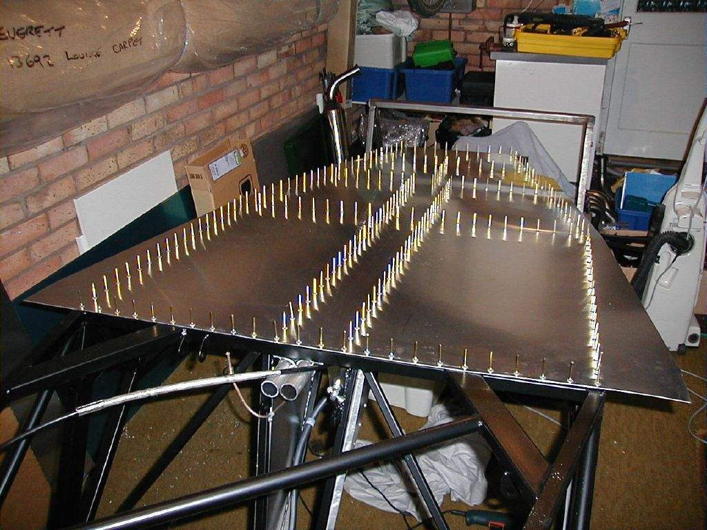 30th October: 3h30m: Drilled some pilot holes into the floor panel, to give a reference when marking out the holes that will be drilled through from the other side. Marked out the hole centres for the rivets, centre punched them and then laid the panel onto the upside-down chassis, and began drilling... After about half the holes, my arms were getting very tired, so I called it a day. 31st October: 3h30m: Finished drilling the holes, then de-burred them. Decided I had enough time to tackle the riveting! 2 hours and 2 blisters later I had a finished panel. Phew!